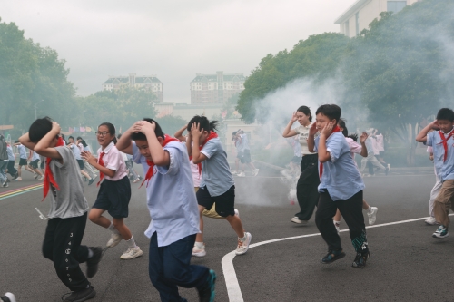 同一时间,防空警报声也划破了校园的宁静,天一实验小学、石塘湾小学、前洲中学、阳山中学、惠山中等专业学校等学校师生立即进入应急状态。各班学生在班主任的指挥下迅速行动,低头弯腰、快速有序撤离教室。各楼层和楼梯口的疏导老师沉着指挥、科学引导,有效防止拥挤、踩踏等次生事故,展现出高效的应急处理能力。